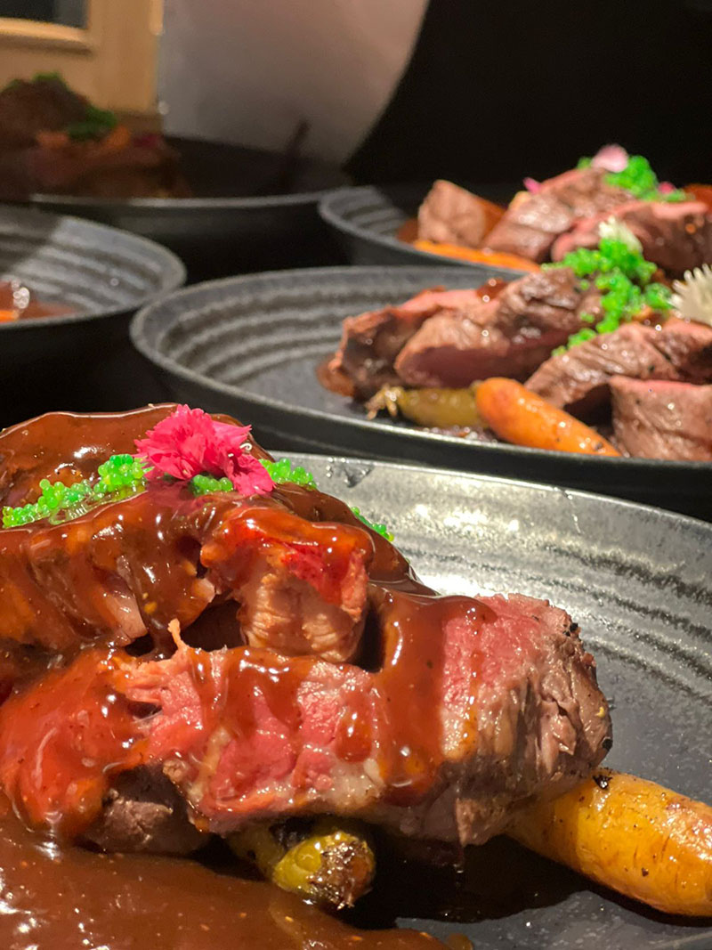 Roast Fillet of Beef, Pomme puree, Confit Shallots Tatin, Onion Puree, Cabbage, Red Wine Jus